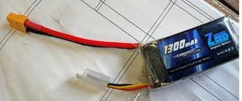 These must be 3 Cell (3s) Lipo batteries which again are freely available. I use Zeee “shorty” 1300 mah batteries which are sold in pairs for £21 to £23 on Aliexpress, free delivery and they are delivered in a couple of days from a UK warehouse. The same item is available from a host of other suppliers but at a higher price. There are thousandsof ba tteries but these do exactly what is required. Coupled with the little 2212 unnamed motor the 1300mAh ones will fly for 4 minutes after a full charge and leave 28% charge in the battery, which is ideal. Running Lipo’s flat is a bad idea.