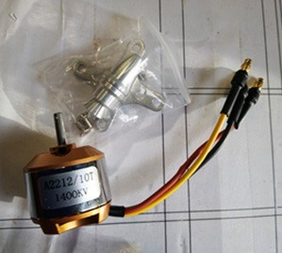 These must be Brushless Outrunner design size 2212, 1400 kv 2212 is the physical size of the stator inside the motor, 22 mm by 12 mm, the motor itself is bigger and weighs 68 grams. The 1400 kv rating is measurement of how many revs it will do under no load per volt.. They are classed as unbranded and are freely available and vary enormously in price but I get mine from Aliexpress at around £4.00 each. They come with a radial mount, all the screws and a spinner. They are easily identifiable gold coloured motors and work very well. See the pictures. Always buy with 3.5 mm bullet connectors to fit straight on the ESC With our battery at 11.1 x 1400 is how fast it will spin. This suits the 8/4 prop perfectly.